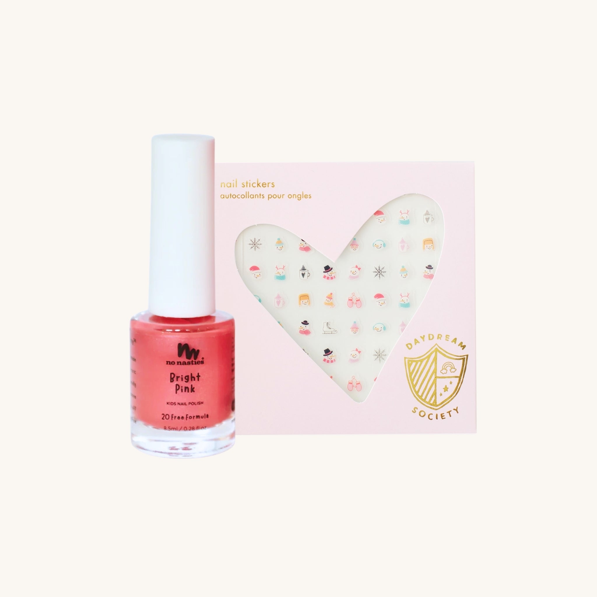 This festive pink Christmas nails bundle is perfect for little ones who love to celebrate the season from head to fingertips. It includes a water-based, peelable pink nail polish by No Nasties and a sheet of Christmas nail art stickers — both designed for safety, creativity, and fun!